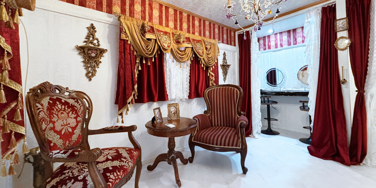 フランス撮影スタジオ GALLERY-O19 LA TERRASSE(ラ・テラス)。池袋駅から徒歩4分、広大な空間に広がるのは、本場フランスの気品漂う撮影舞台。最大の特徴は、周囲をすべて鎧戸で囲った開放的なバルコニーエリアです。都心にいながら柔らかな自然光に包まれた屋外撮影が叶います。さらに、宮殿の控室を彷彿とさせる豪華な準備スペースも完備。アンティークの深みと光が溶け合う、至高の一枚をここで。ただいまキャンペーン中!スタジオレンタル料金がナント半額!